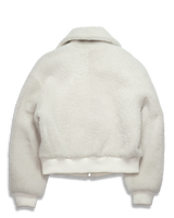 Stay cozy and stylish in this Shearling Jacket in White. Made of 100% curly wool shearling, the unbelievably soft material and snug-fit make it a must have for cooler weather. For an oversized fit, size up.
