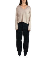 This cotton cashmere v-neck Tee is MACHINE WASHABLE, a thin lightweight classic knit blend sweater; featuring a v-neck with a wide rib, rolled edges, and a boxy fit.